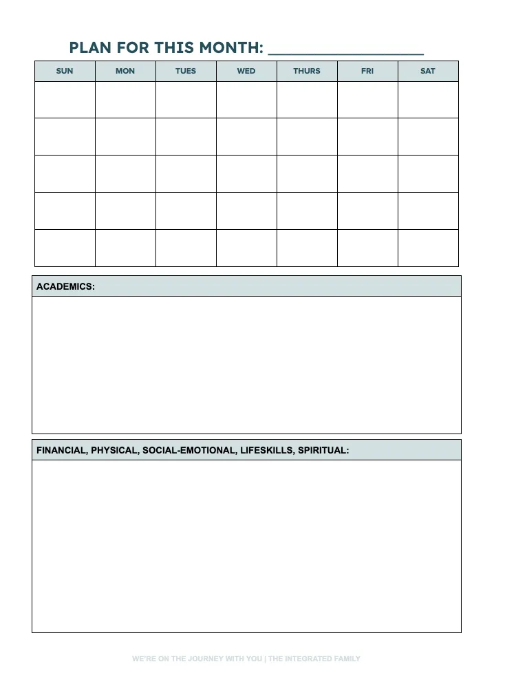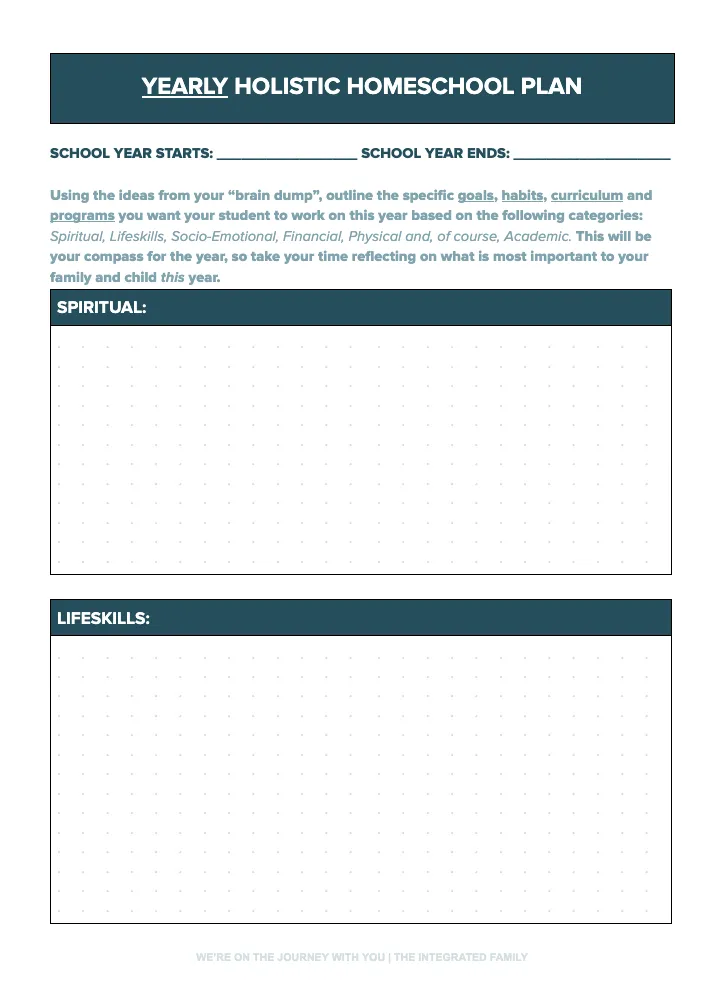 The Holistic Homeschool Planner centers around these ideas, providing space to intentionally craft your student's learning experience across multiple areas of life (ex. financial, spiritual & physical) as well as academics (hence the name: holistic).
